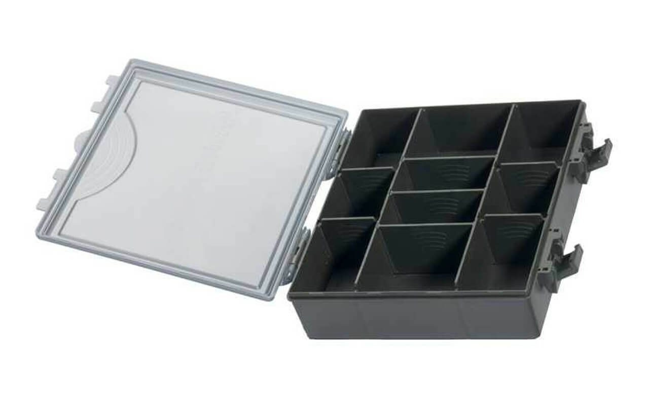 Krabička na príslušenstvo z odolného plastu s posuvnými priehradkami.
